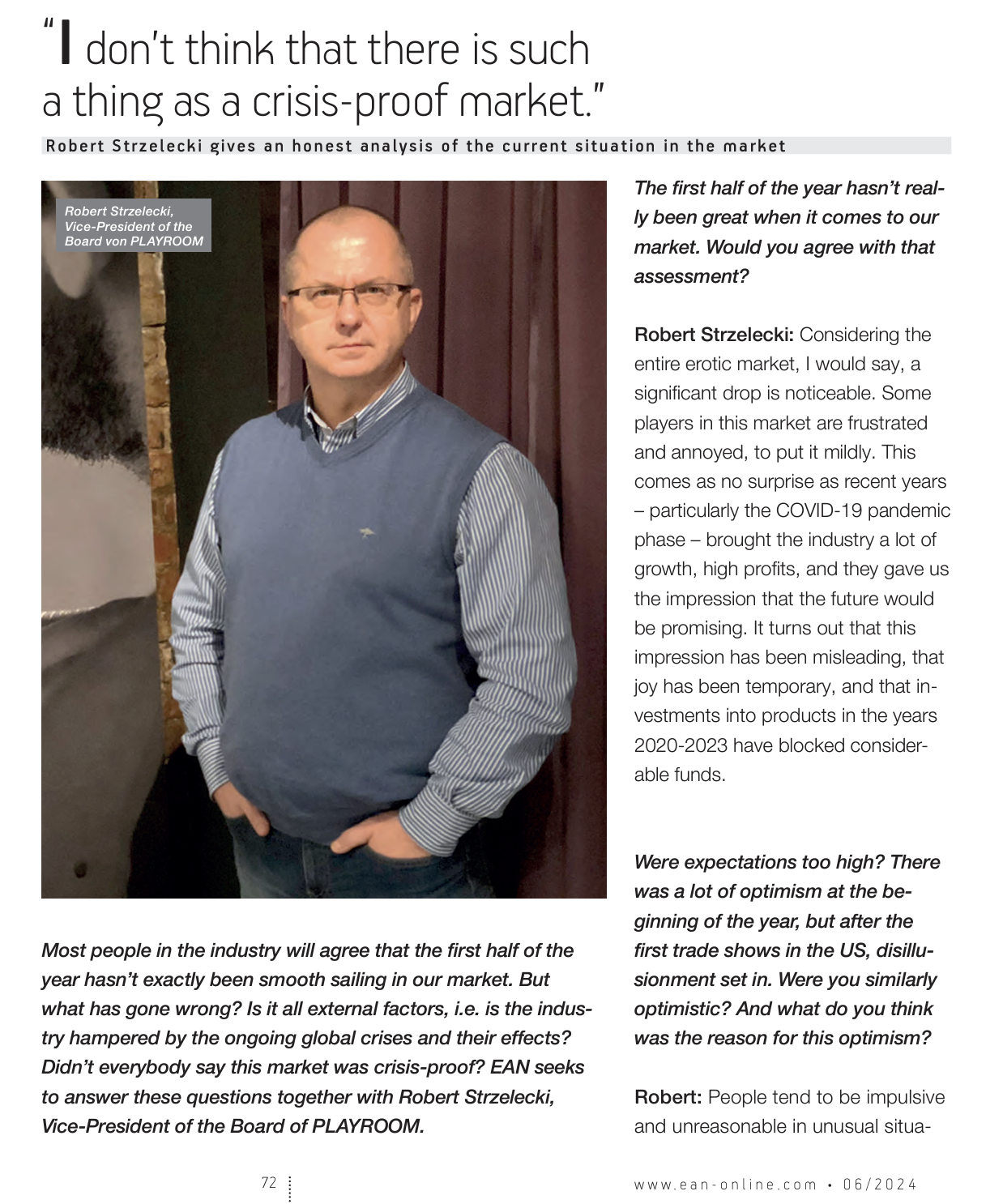 - There was a lot of optimism at the beginning of the year, but after the first trade shows in the US, disillusionment set in. Were you similarly optimistic - or, to put it another way, what do you think was the reason for this optimism? People tend to be impulsive and unreasonable in unusual situations. When you celebrate your success, you usually fail to analyze the causes but remain emotional and happen to take decisions with ease. The joy, or perhaps euphoria, that accompanied the success during the COVID-19 pandemic time – especially in the e-commerce – obscured the essential issue: the cause analysis (sales success in this case), assessment of effects (how the success is going to influence the organization) and predictions about the future (tendencies versus anomalies). Now the erotic industry has got nervous and it results from the lack of reasonable evaluation of what actually happened in the years 2020-2023 and its consequences in the future. It they had assessed the situation in a proper way, they would not be surprised about what we have to deal with today.