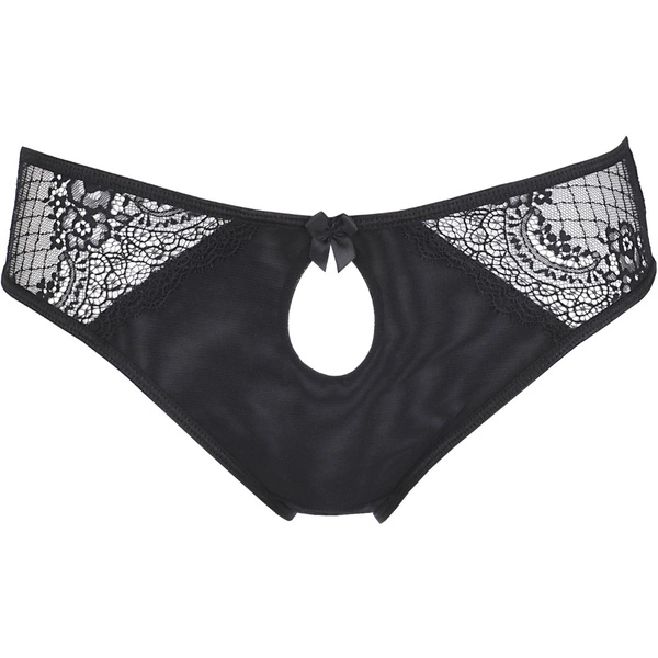Charyzmatyczne figi z uwodzicielskimi wycięciami z przodu i na pośladkach z pewnością skuszą męskie spojrzenie. Wykończone wygodnym i miękkim tiulem oraz śliczną koronką, w tylnej części seksowny paseczek zamocowany dla dwóch plastikowych kółeczkach. W klinku miękka bawełna dla wygody noszenia.