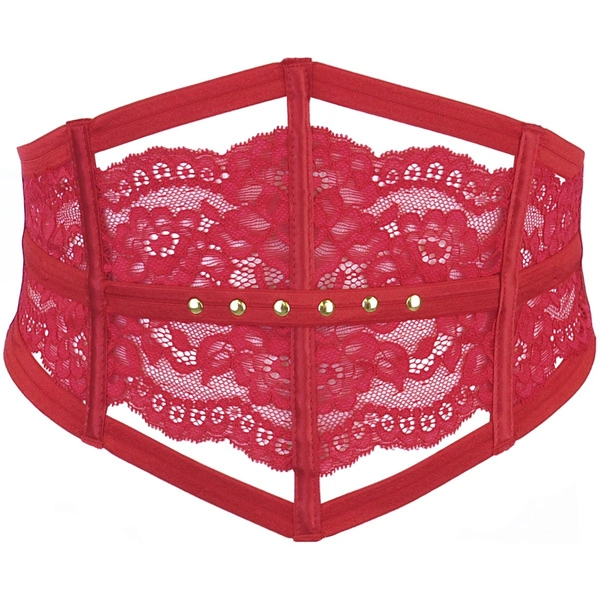 Koronkowy, czerwony pas z wbudowanymi bocznymi i środkowymi fiszbinami niezwykle przyozdabia i dopełnia komplet V-9771,9778, tworząc komplet od którego nie można oderwać wzroku. Zabłyśnij wyjątkowym zestawem w odcieniu głębokiej czerwieni. Model posiada ćwieki w kolorze złota w środkowej części, z tylnej części potrójne, elastyczne paski łączą dwurzędową haftkę.