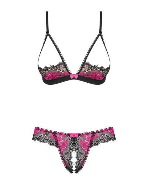 The Tulia set is lingerie that leaves no room for ambiguity. The pink and black lace strikingly accentuates the body, and the revealing design adds courage and sex appeal. The triangle cups on thin straps leave the breasts partially exposed, and a small bow between them draws the eye to the center of the neckline.