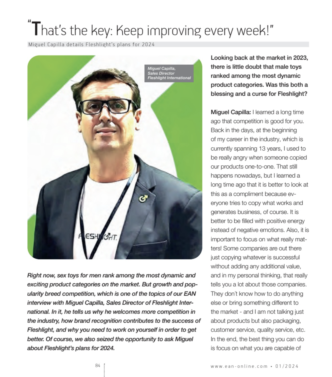 W styczniowym wydaniu European Adult News Magazine ukazał się wywiad z Miguel Capilla z Felshlight. W obszernym wywiadzie mówi o tym, że rynek gadżetów erotycznych dla mężczyzn należy do tych najintensywniej i najszybciej rozwijających się.