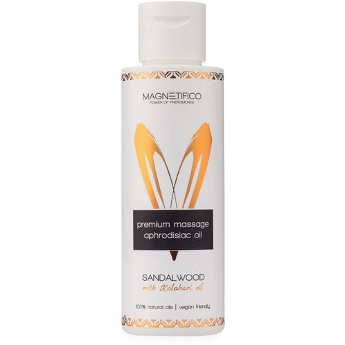 Magnetifico Aphrodisiac Massage Oil Sandalwood 100 ml to zmysłowy olejek do masażu, który działa na ciało i zmysły dzięki intensywnemu aromatowi drzewa sandałowego i starannie dobranej mieszance naturalnych składników. Jego aromaterapeutyczne właściwości rozbudzają zmysły, wprowadzając w stan relaksu i pobudzenia jednocześnie. Lekka, jedwabista konsystencja zapewnia długi poślizg, nie pozostawiając tłustego filmu – idealna do pełnych pasji masaży, które z łatwością mogą przerodzić się w coś więcej.