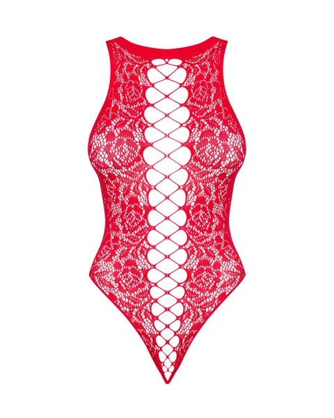 Body B120 to ognista propozycja dla kobiet, które chcą zawładnąć nie tylko sercem, ale i zmysłami swojego partnera. Czerwony materiał o dekoracyjnym splocie zaskakuje odważnym fasonem, głębokimi wycięciami i imitacją krzyżowanego wiązania z przodu. Duże wycięcie na plecach dodaje pikanterii, a zamknięty krok sprawia, że model ten pozostawia nutę tajemnicy. Elastyczna dzianina idealnie dopasowuje się do sylwetki, podkreślając jej kształty i zapewniając wygodę przez całą noc.