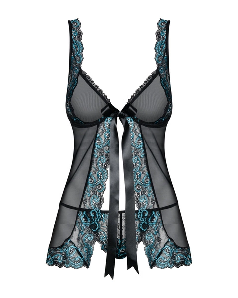 Obsessive Amanta babydoll – rozkoszny urok błękitnej koronki w postaci eleganckiej koszulki z rozcięciem. Całość wykonana jest z delikatnej siateczki w kolorze czarnym, ozdobionej na brzegach czarno-błękitną koronką o kwiatowym motywie. Koronka dekoruje także brzegi prześwitujących miseczek oraz ramiączka. Usztywniane fiszbinami miseczki połączone są ze sobą niezauważalnym zapięciem dodatkowo zamaskowanym satynową kokardą. Komplet nie byłby pełen, gdyby nie dołączone do kompletu stringi także ozdobione delikatną koronką. Ponad to Obsessive Amanta posiada regulowane ramiączka, co ułatwia jej dopasowanie do ciała. Amanta jest świetna dla Pań o średnim biuście i w miarę płaskim brzuszku. W składzie materiału znajdziemy 94% poliamid, 6% elastan.