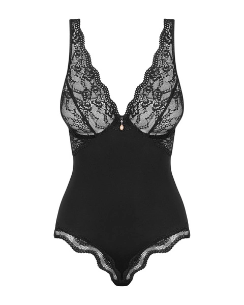 Koronkowe detale nadają całości lekkości i wytwornego charakteru, a usztywniane miseczki z fiszbinami pięknie eksponują biust, modelując go i unosząc. Regulowane ramiączka pozwalają dopasować body do sylwetki z pełnym komfortem, natomiast gładko skrojona dolna część podkreśla linię pośladków i bioder w sposób niezwykle ponętny. Subtelna ozdoba z beżową perłą dodaje temu modelowi szlachetności i wyjątkowego uroku.