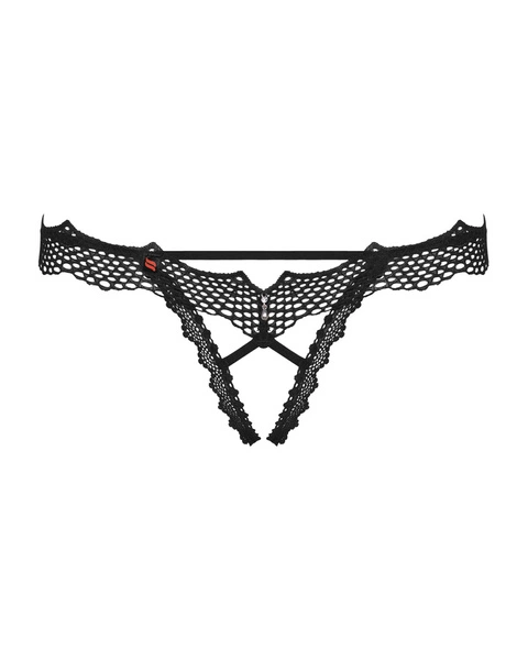 Czarne stringi Bravelle to bielizna stworzona do flirtu. Otwarte w kroku, zbudowane z delikatnej siateczki i cienkich paseczków tworzących efektowną kompozycję, doskonale podkreślają biodra. Biżuteryjna zawieszka umieszczona z przodu dodaje im blasku i elegancji. Ten model to pikantny detal, który mówi więcej niż tysiąc słów.