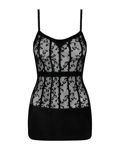Sukienka Obsessive D605 – nietypowa „mała czarna” dla odważnych. Całkowicie bezszwowa sukienka na ramiączkach wykonana jest z bardzo elastycznego i miękkiego w dotyku materiału. D605 sięgająca tuż za pośladki idealnie eksponuje kobiecy kształt i zgrabne nogi. Górna część sukienki wykonana jest z prześwitującej dzianiny ozdobionej zwierzęcym motywem. Symetryczny układ pionowych pasków optycznie wysmukla sylwetkę. Jednolity dół kusząco opina pośladki. Sukienka Obsessive D605 prezentuje się najlepiej na kobietach o nieco pełniejszym kształcie. W składzie materiału znajdziemy 90% nylon, 10% elastan.