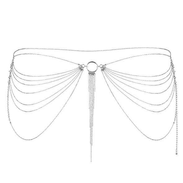 Biżuteria erotyczna Bijoux Indiscrets Desir Magnifique to idealna propozycja dla kobiet, które uwielbiają ozdoby w każdej postaci. Ta jest wyjątkowa, gdyż będzie widoczna jedynie dla Twojego partnera. Całość składa się z delikatnych łańcuszków i ma formę siateczki, którą możesz założyć na biust lub biodra. Główny łańcuszek oplata biodra lub biust, zaś kółeczka z przodu odchodzą kolejne rzędy i tworzą piękny ażurowy wzór. Dodatkowo kilka łańcuszków przechodzi między pośladkami lub piersiami i idealnie dopełnia całość. Taka biżuteria erotyczna podziała na zmysły i idealnie sprawdzi się podczas gorących chwil. Prezentuje się ona nowocześnie i stylowo. Już teraz zaprezentuj się w tak kuszącym i seksownym wydaniu a na pewno żaden mężczyzna nie będzie w stanie się Tobie oprzeć. Poczuj się jeszcze bardziej kobieco i uwodzicielsko. Ta siateczka biżuteryjna na również za zadanie wprawić Ciebie w odpowiedni nastrój. Kiedy raz wypróbujesz jej działanie, to będziesz po nią regularnie sięgać.