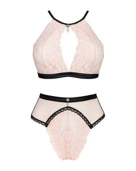 Komplet Lilines w kolorze jasnoróżowym to połączenie delikatności i kobiecego uroku. Miękki biustonosz z dekoltem w kształcie łezki pięknie układa się na piersiach, a regulowane ramiączka oraz zapięcie z tyłu pozwalają dopasować go do sylwetki. Wysokie majtki podkreślają talię i akcentują linię bioder. Biżuteryjne zawieszki umieszczone na dekolcie i brzuchu wprowadzają nutę elegancji i stylu.