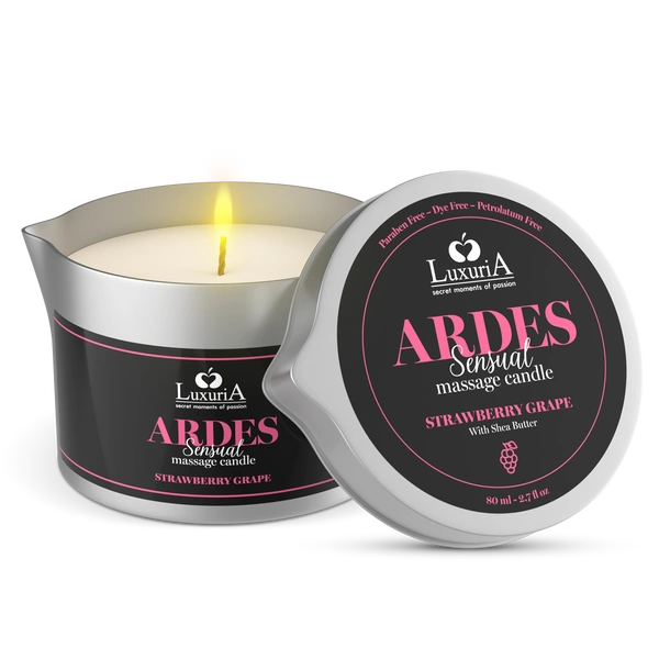 Luxuria Ardes Massage Candle Strawberry Grapes to zmysłowa świeca do masażu stworzona na bazie masła shea, która pod wpływem płomienia zamienia się w ciepły, aromatyczny olejek. Jej intensywny zapach łączący słodycz truskawek i winogron tworzy atmosferę sprzyjającą bliskości i rozbudza zmysły, wprowadzając w stan głębokiego relaksu i intymnej przyjemności.