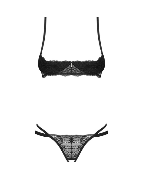 Komplet Nutris to idealna propozycja na gorącą noc we dwoje. Otwarty biustonosz z fiszbinami odsłania i podkreśla biust, a koronkowe wykończenie dodaje lekkości i klasy. Seksowne stringi z wycięciem i paskami na biodrach subtelnie eksponują pośladki, zapewniając przy tym maksymalny efekt wizualny.