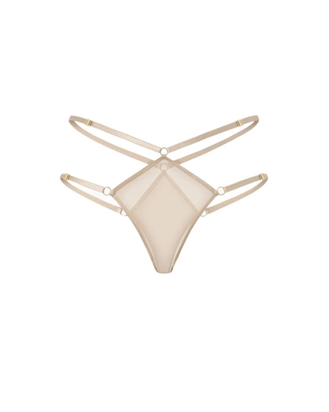 Stringi Reina Nude to bielizna, która subtelnie uwodzi i podkreśla kobiece piękno. Wykonane z delikatnej, prześwitującej siateczki w cielistym odcieniu, otulają ciało niczym druga skóra, podkreślając biodra i pośladki w niezwykle ponętny sposób. Ich minimalistyczny krój eksponuje kształty, a złote detale dodają im luksusowego, wyrafinowanego charakteru.