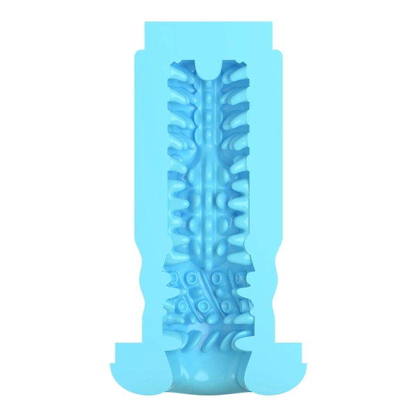 After Kiss to wymienny rękaw do masturbatora z serii Super Series, zaprojektowany z myślą o zapewnieniu dynamicznej, zmiennej stymulacji. Wnętrze rękawa dzieli się na trzy odrębne strefy, z których każda oferuje inną strukturę – od łagodnych żeberek po wyraźne, spiralne wypustki i gęsto ułożone guzki.