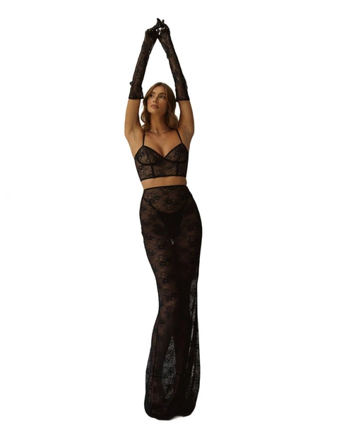 Czarna koronka nadaje spódnicy luksusowego charakteru, czyniąc ją idealnym wyborem zarówno jako bieliźniany akcent, jak i odważny element stylizacji na wyjątkowe okazje. Komfortowa w noszeniu, miękko dopasowuje się do ciała, podkreślając pewność siebie i naturalne piękno kobiecej sylwetki.