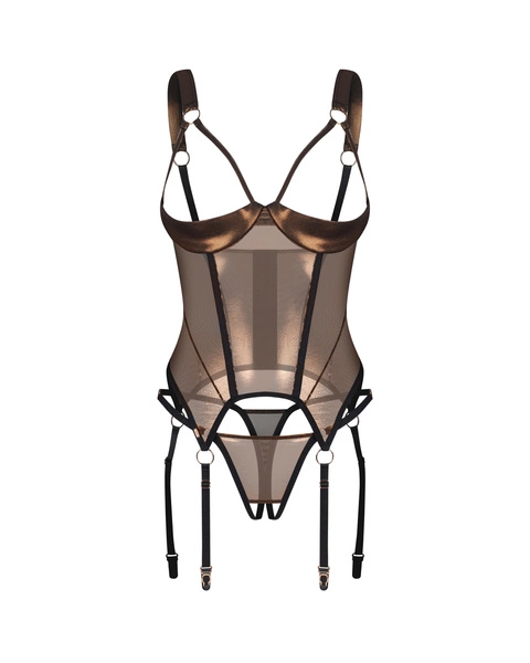Połyskujący gorset i otwarte stringi Soranna od Obsessive to uosobienie zmysłowej elegancji i kobiecej siły. Transparentna siateczka z delikatnym, złotym połyskiem otula ciało, podkreślając jego kształty i dodając blasku. Fiszbiny pod biustem zapewniają efektowne uniesienie, a pionowe przeszycia wysmuklają sylwetkę, tworząc perfekcyjny efekt wizualny.