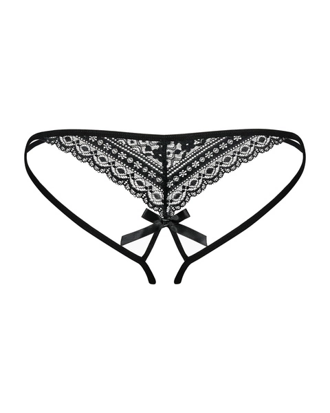 Obsessive Picantina majtki otwarte – słodka niespodzianka w postaci zadziornych majteczek, które bynajmniej nie wymagają ich zdjęcia. Majtki otwarte Picantina wykonane są w całości z bardzo ozdobnej koronki materiału o lekko geometrycznym charakterze połączonej z układem elastycznych pasków kusząco podkreślających kobiece kształty. Przód majteczek oraz ich tył na wysokości połowy pośladków udekorowane są drobnymi, satynowymi kokardkami.