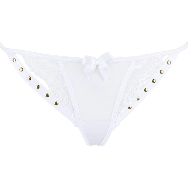 Model intrygujący wzorem z przodu, bogactwem ćwieków w kolorze złotym, zachęcają do zmysłowych odkryć… Przepięknie wycięta koronka podkreśli urodę Twego ciała, zwłaszcza gdy sięgniesz także po biustonosz V-9791!