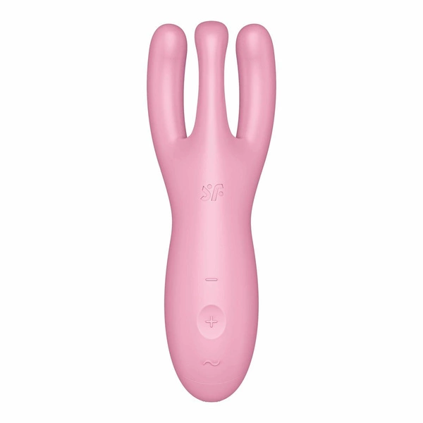 Satisfyer Threesome 4 to wibrator typu lay-on, który zapewnia szeroką i intensywną stymulację łechtaczki oraz warg sromowych. Trzy mocne silniki umieszczone w elastycznych ramionach równomiernie rozprowadzają wibracje: dwa boczne ramiona otulają wargi sromowe, a środkowe ramię skupia się na łechtaczce, oferując dodatkowe wrażenia przy jego opuszczeniu.