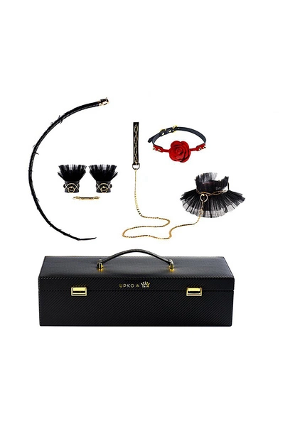 Elegancki pakiet Zalo & UPKO zawiera kajdanki, smycz, pejcz oraz ball gag. Całość zapakowana jest w piękny kufer z imitacji skóry, wnętrze wyłożony aksamitem.